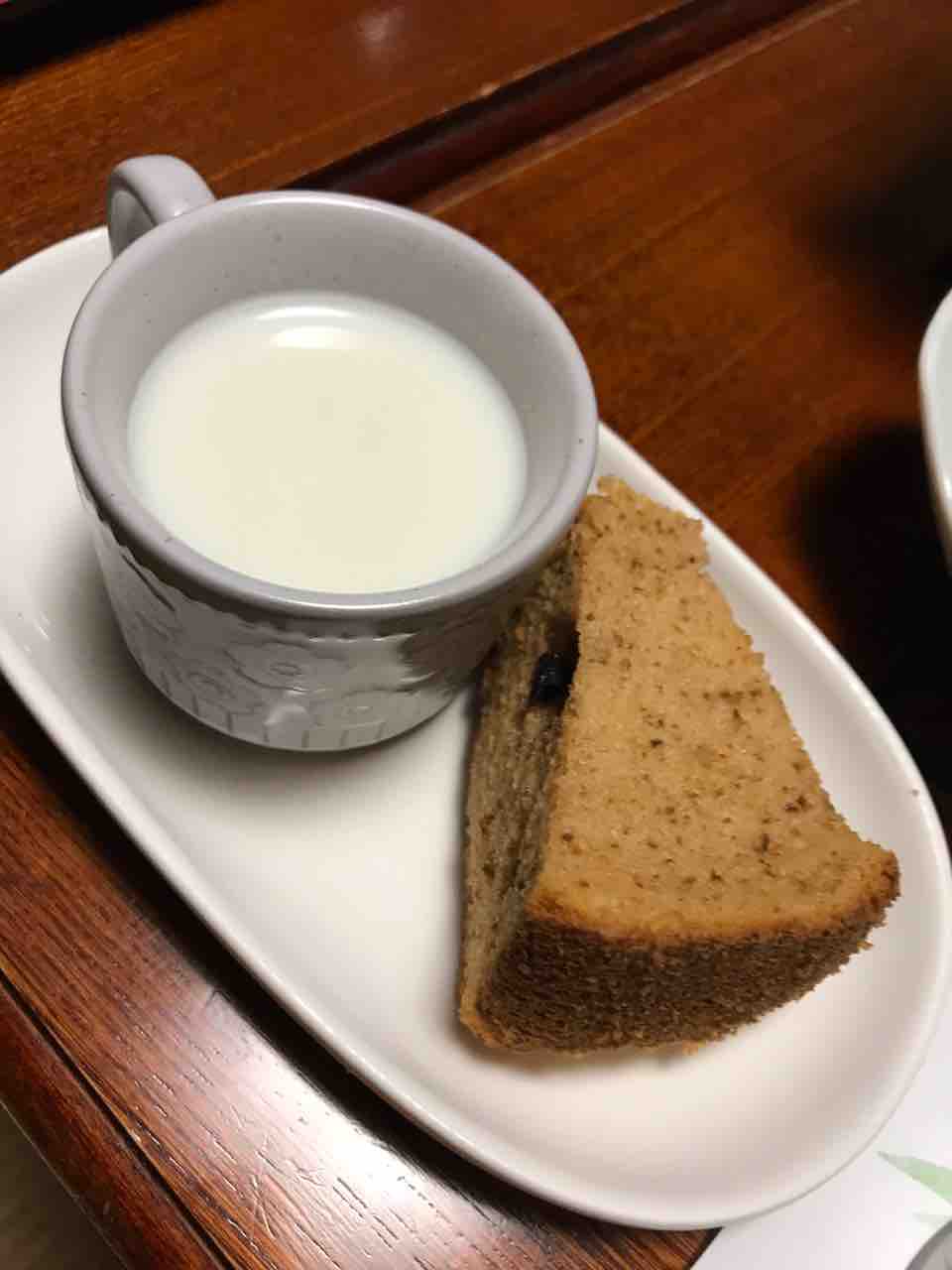 デザートのシフォンケーキと甘酒の牛乳割りかな?