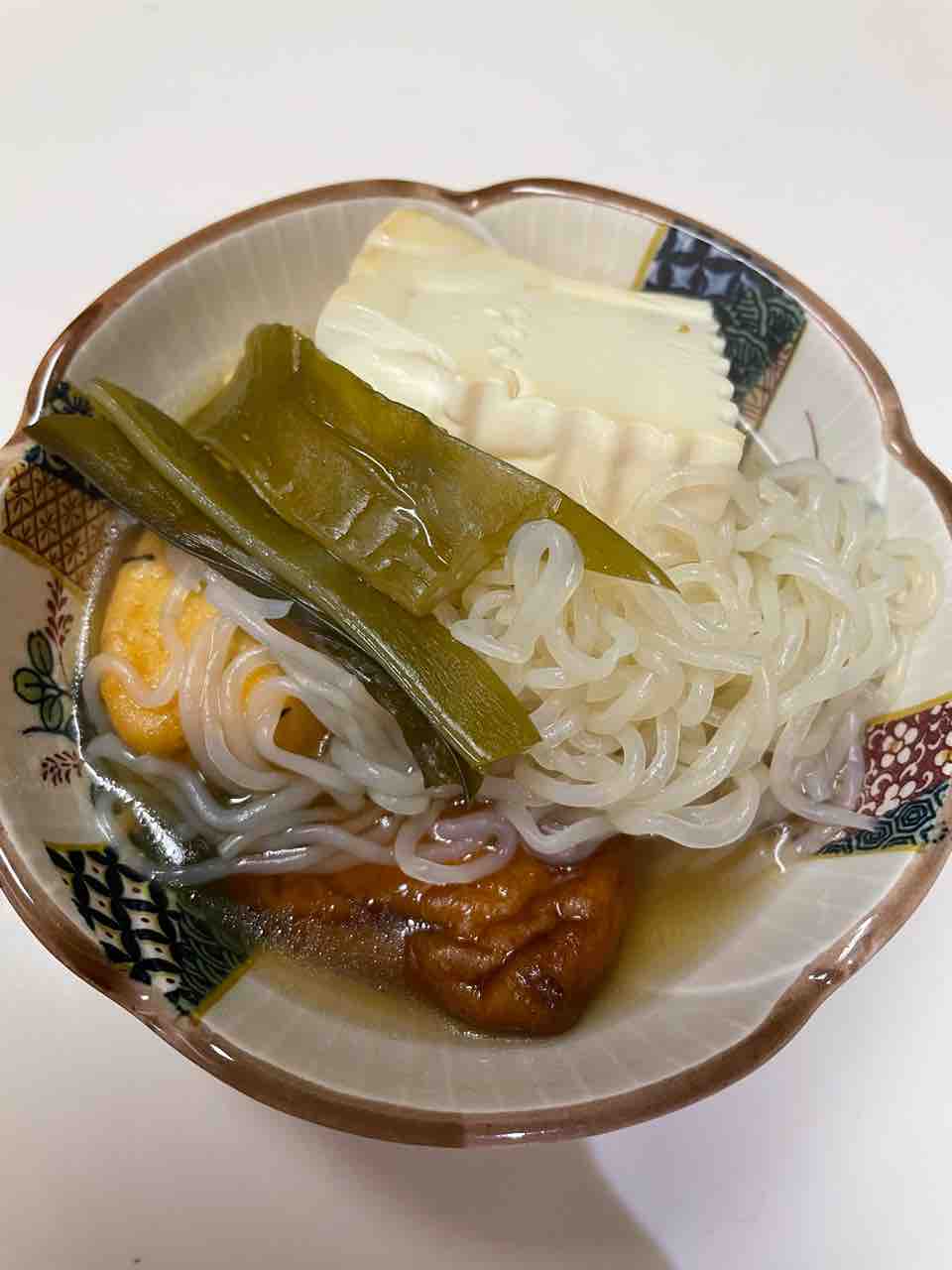 玉ねぎ、糸こんにゃく、わかめの茎を加えておでんの素で煮ただけ簡単です