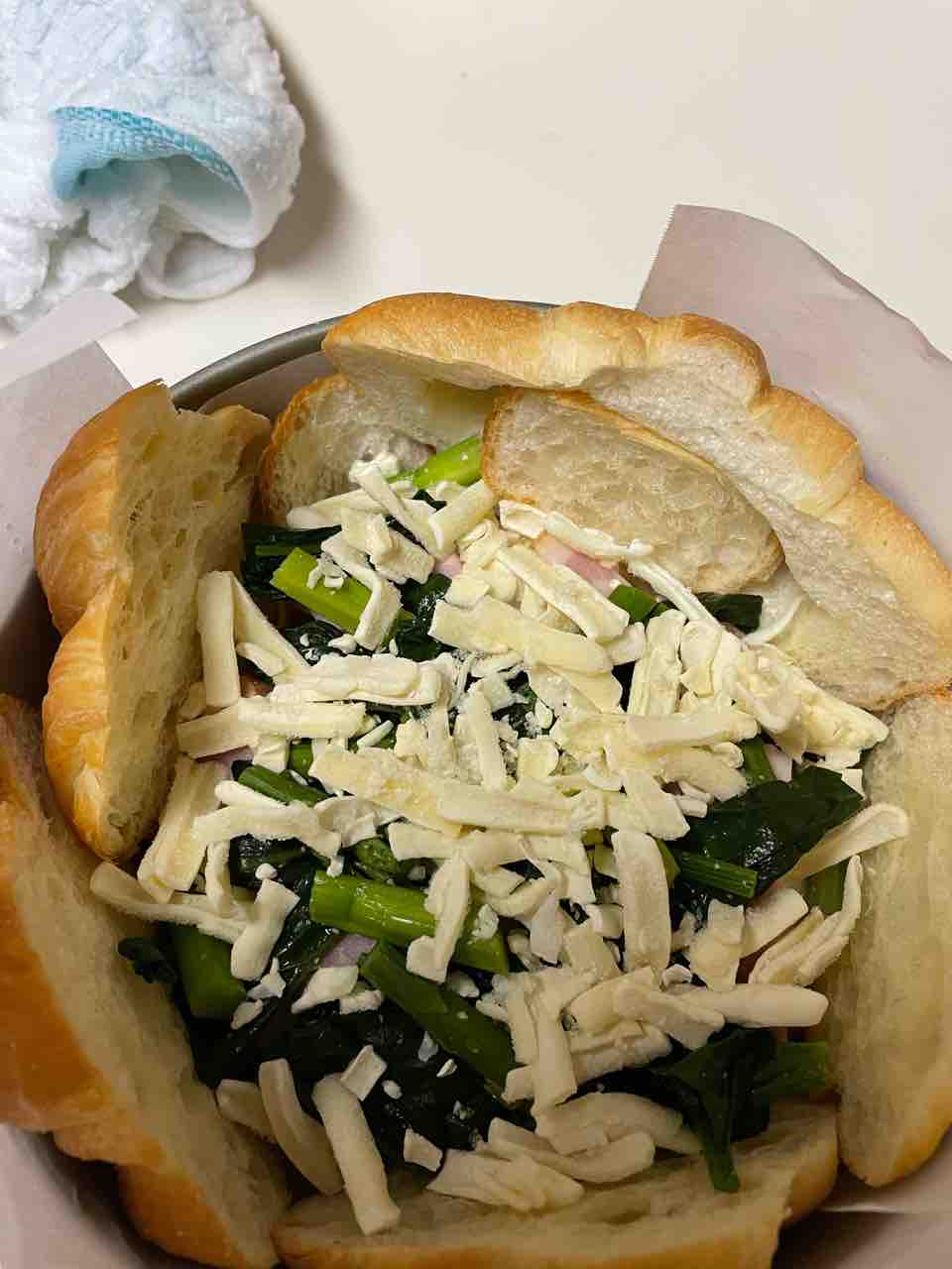 卵2個、生クリーム約100ml、牛乳大2、塩コショウ少々を混ぜて流し込みましたが